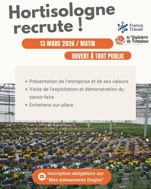 Inscription obligatoire sur “Mes Évènements Emploi” https://mesevenementsemploi.francetravail.fr/mes-evenements-emploi/evenement/608166/plongez-au-c-ur-de-l-horticulture-decrochez-un-contrat-saisonnier-chez-horti-sologne-fontaines-en-sologne
